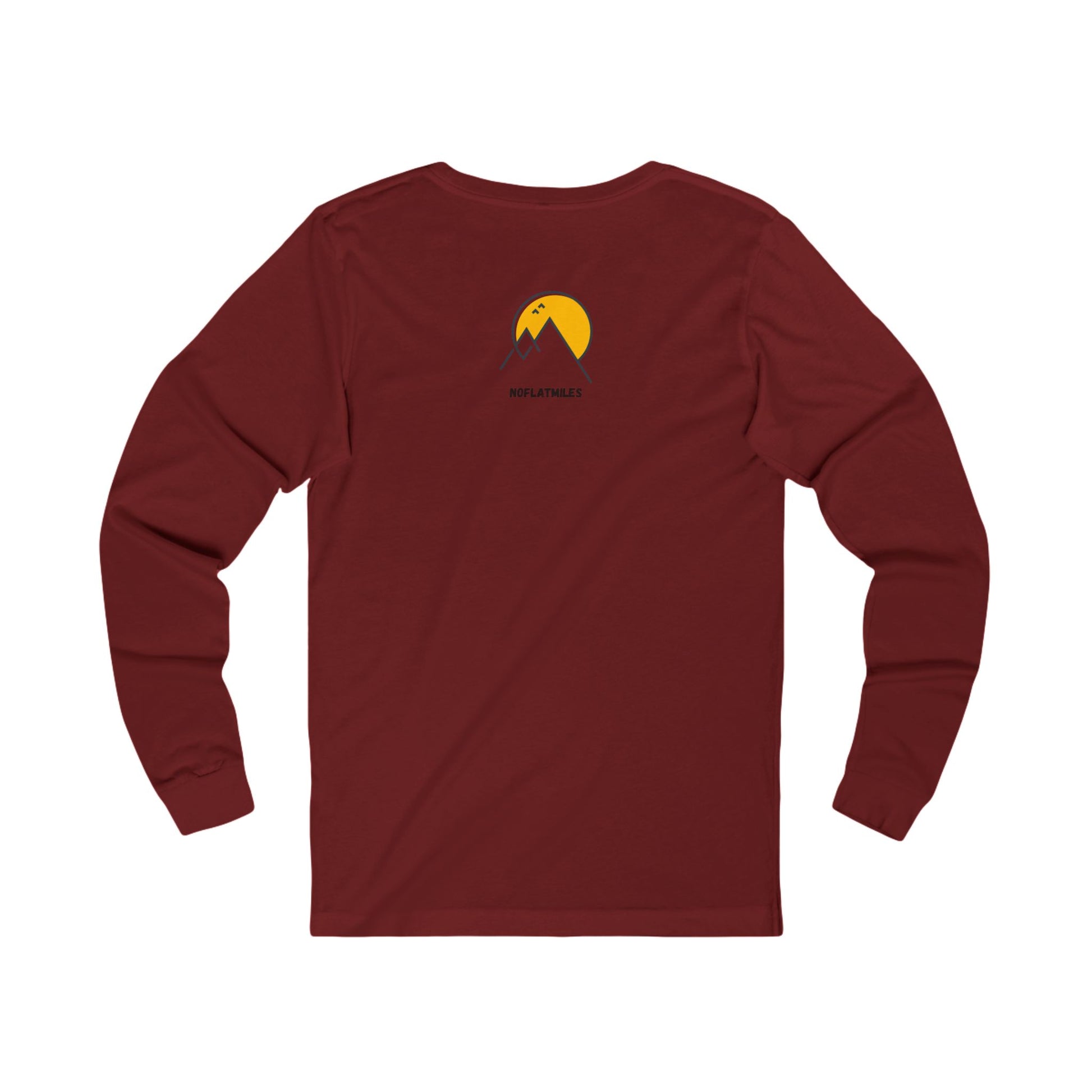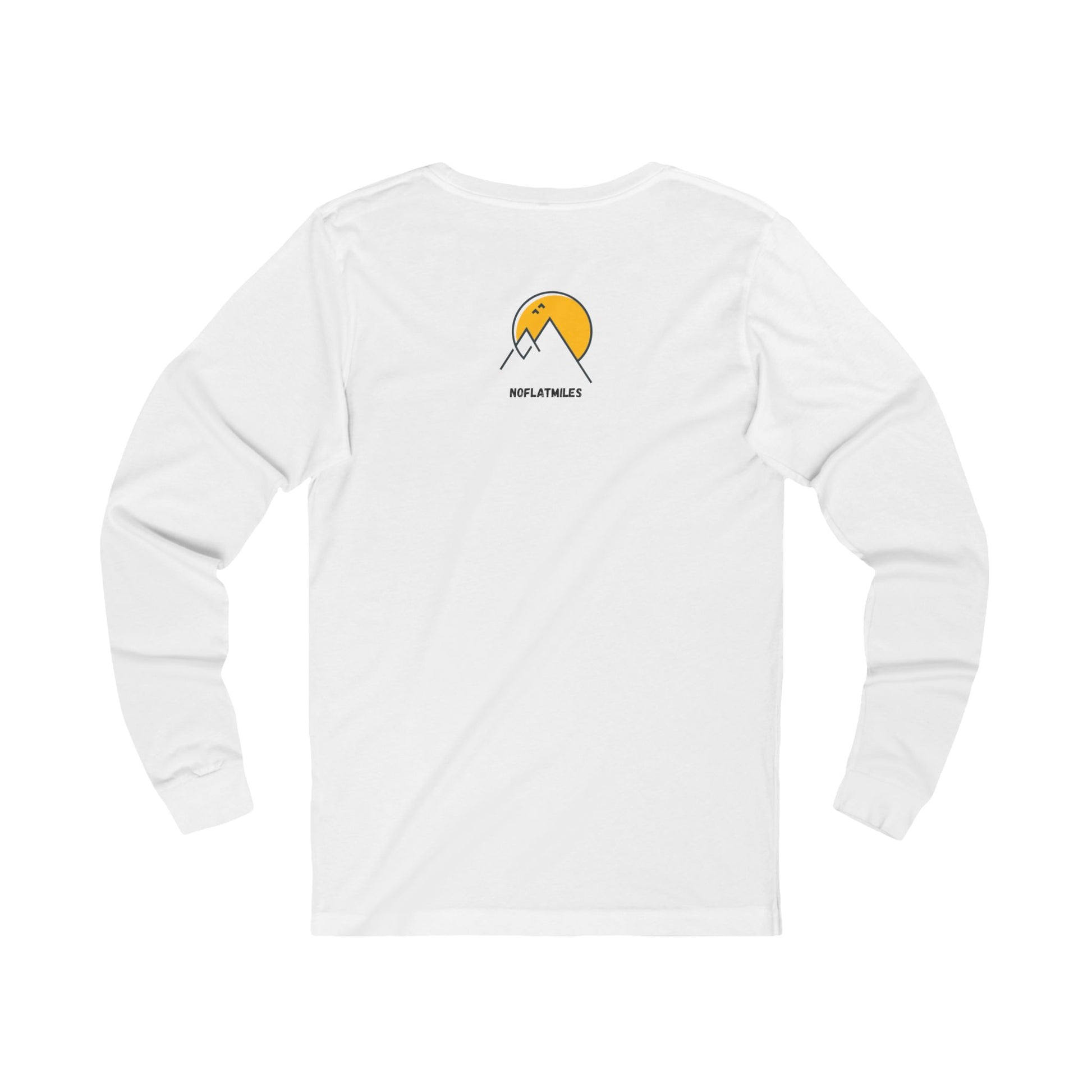 Perfect for crisp mornings and chilly ridge lines, this long sleeve tee keeps you warm without sacrificing breathability. The custom artwork pairs a sweeping mountain vista with our signature NOFLATMILES logo, inspiring you to push for the peaks. Constructed with side seams for a flattering fit, it uses soft jersey fabric (predominantly 100 % cotton) with a ribbed collar and shoulder taping to maintain its shape. Wear it as a standalone layer or under a shell – either way, it’s a comfy reminder that flat miles don’t count. Printed in the USA.