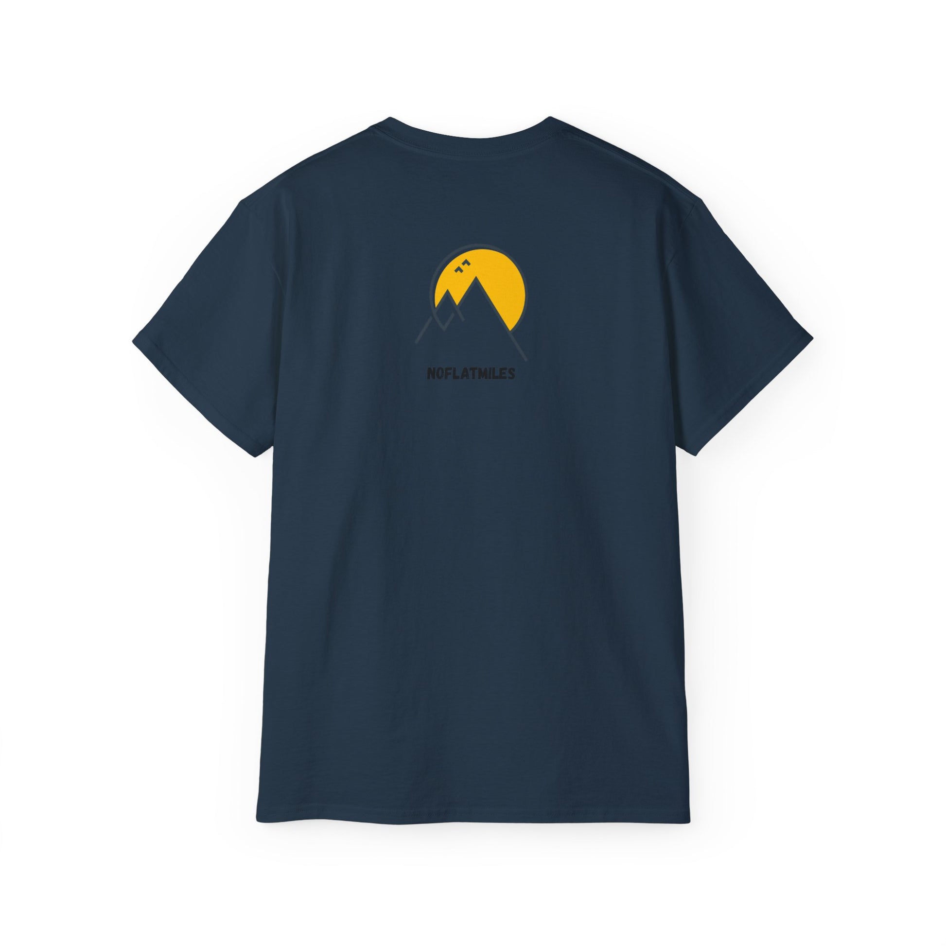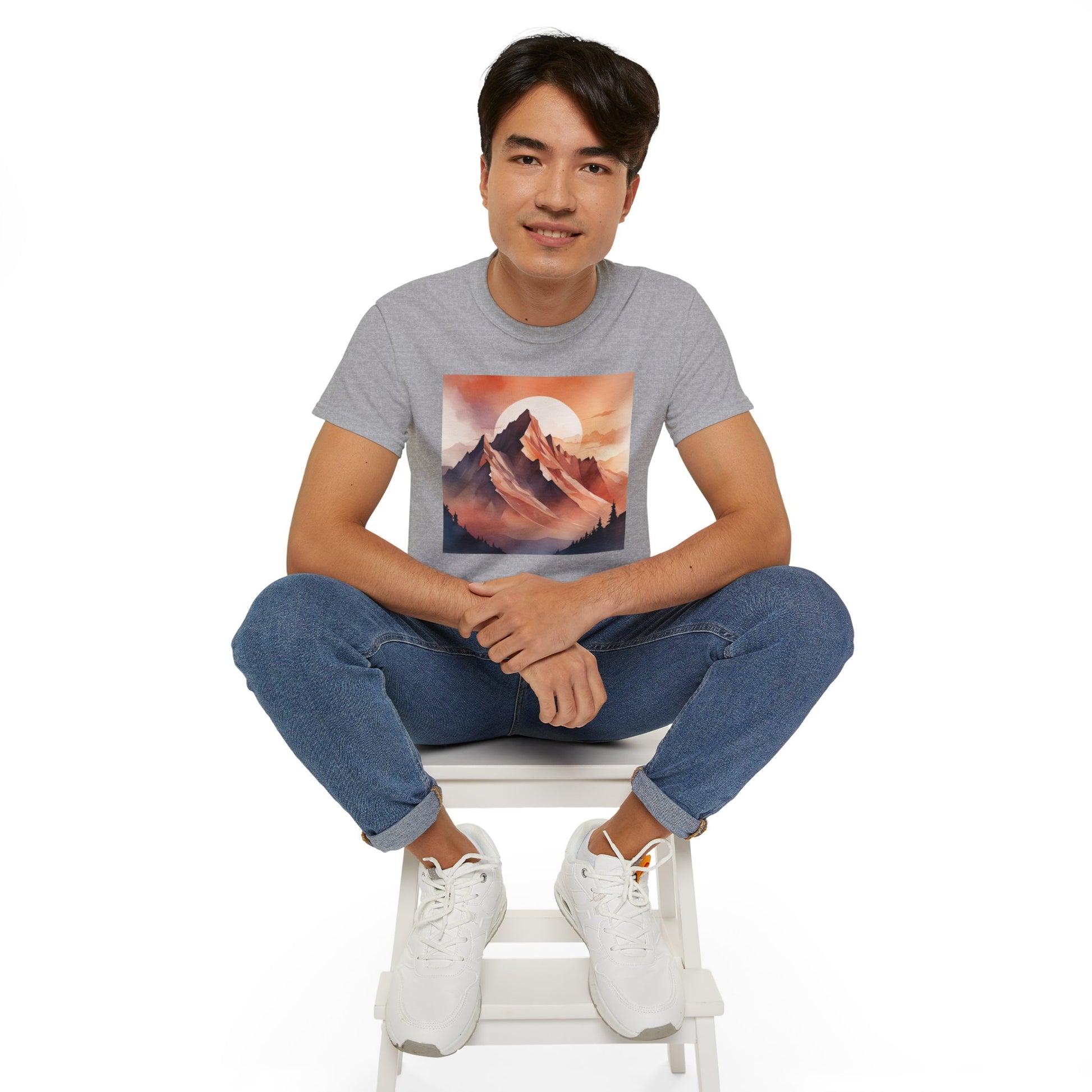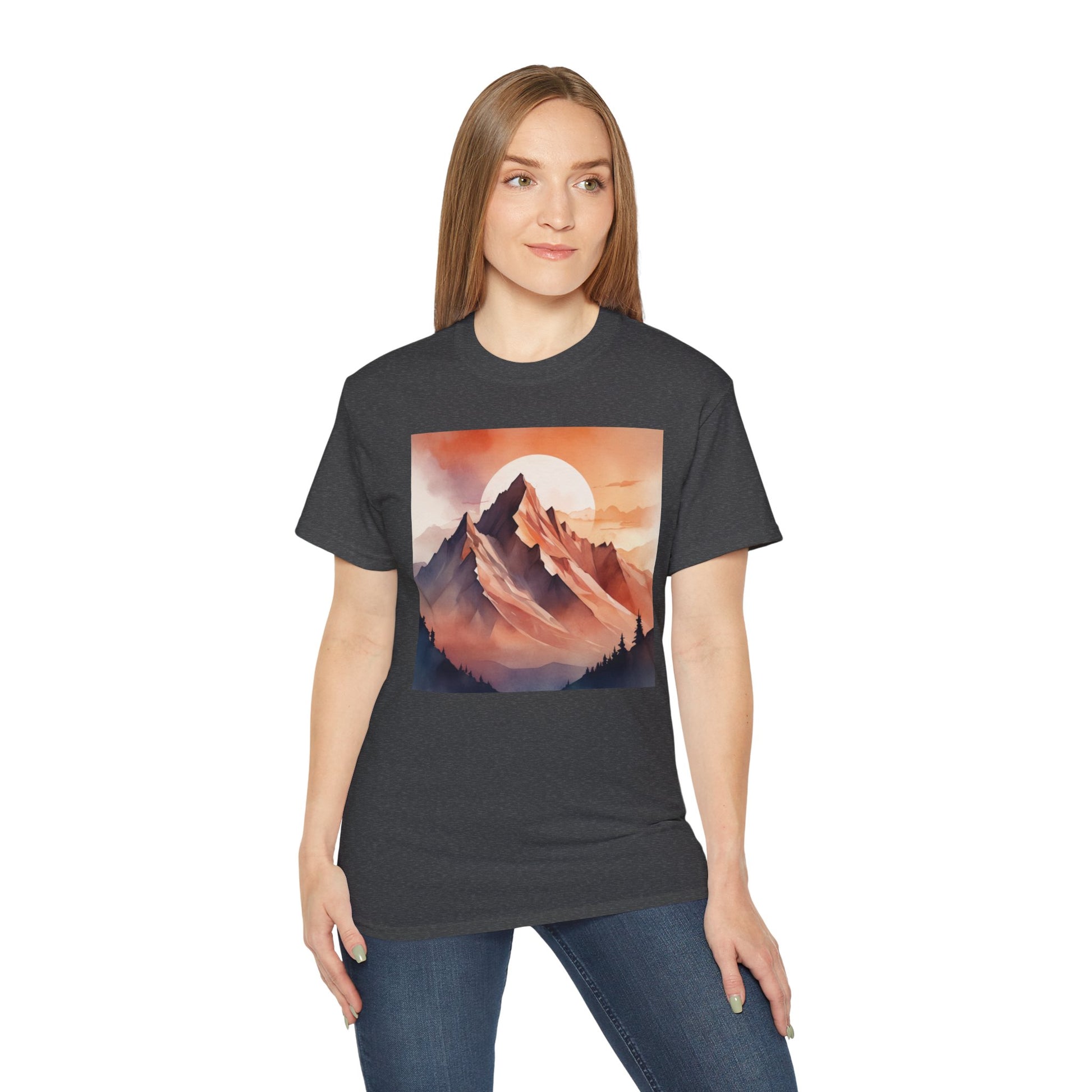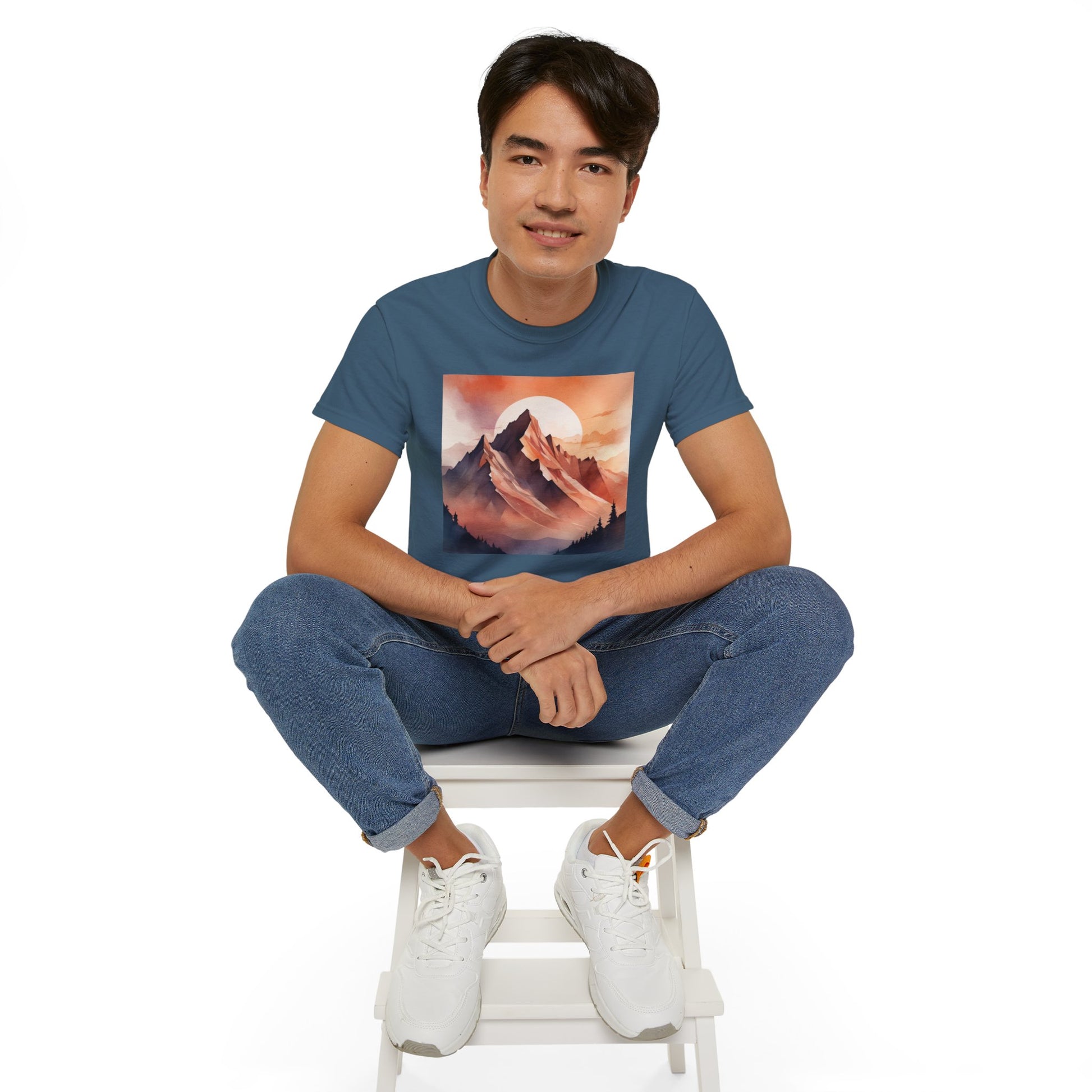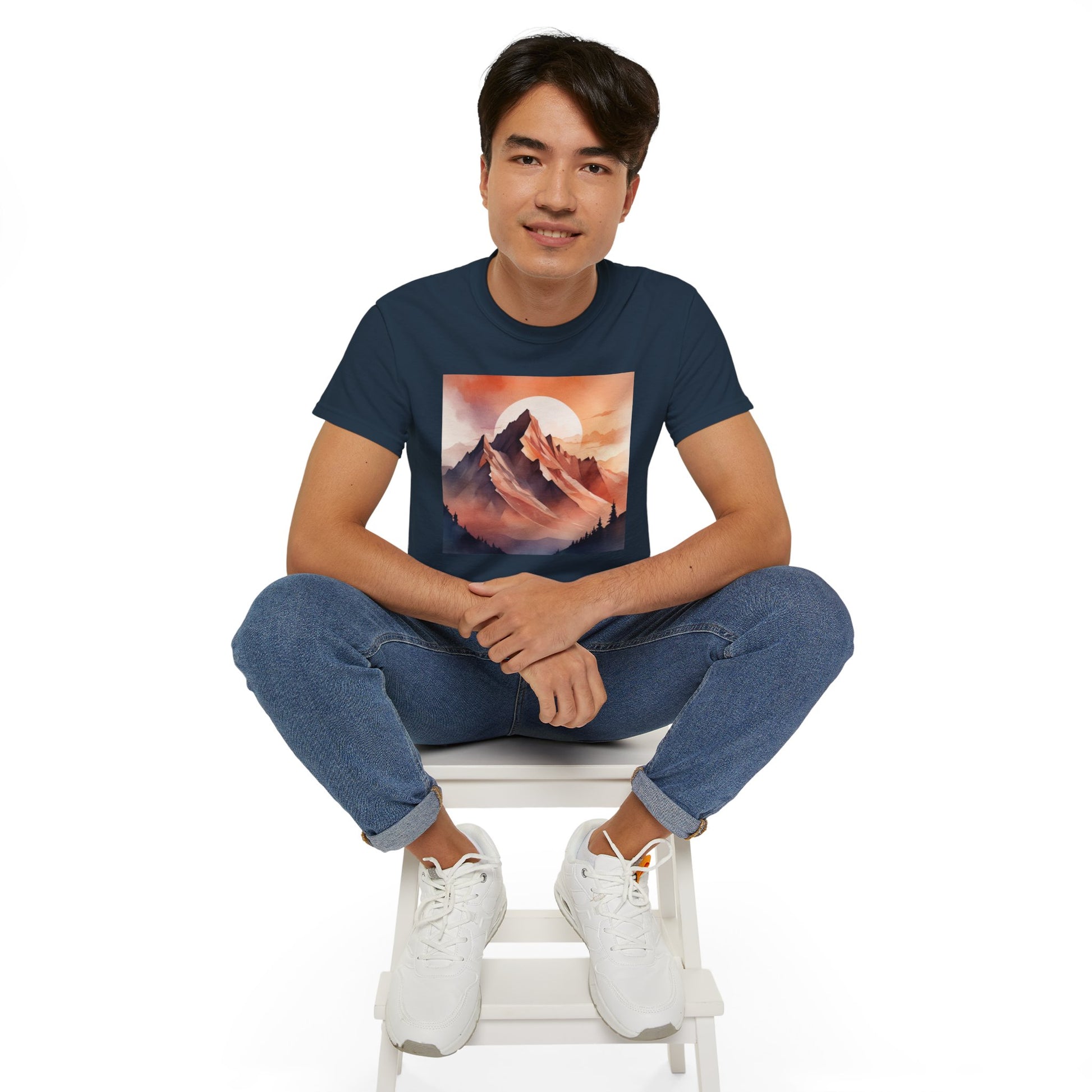Layered peaks in watercolor haze, a sun big enough to make plans, and a path that doesn’t know what “flat” means. This tee wears like that last golden mile when everything slows down and you still send it. Put it on and your day gets contour lines.