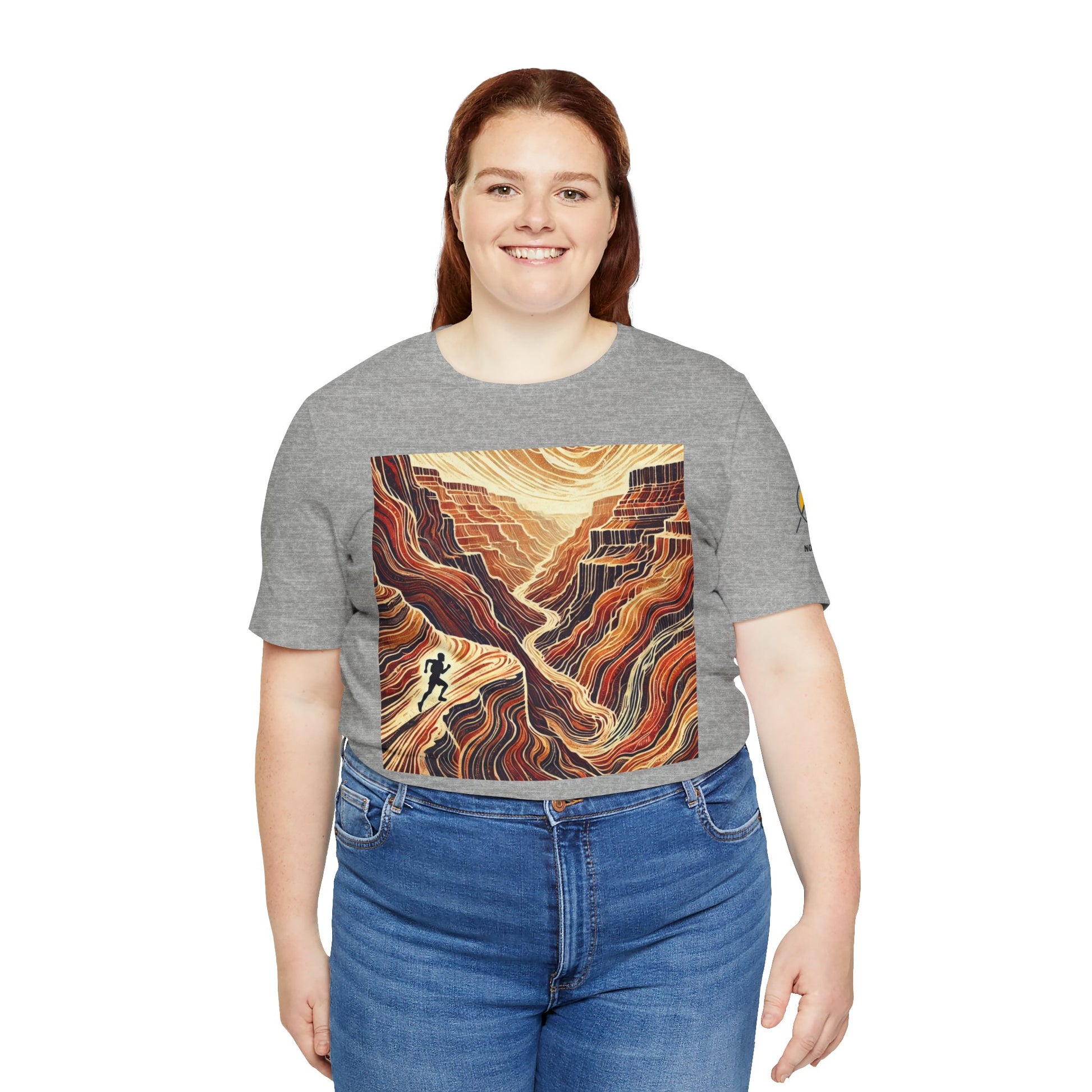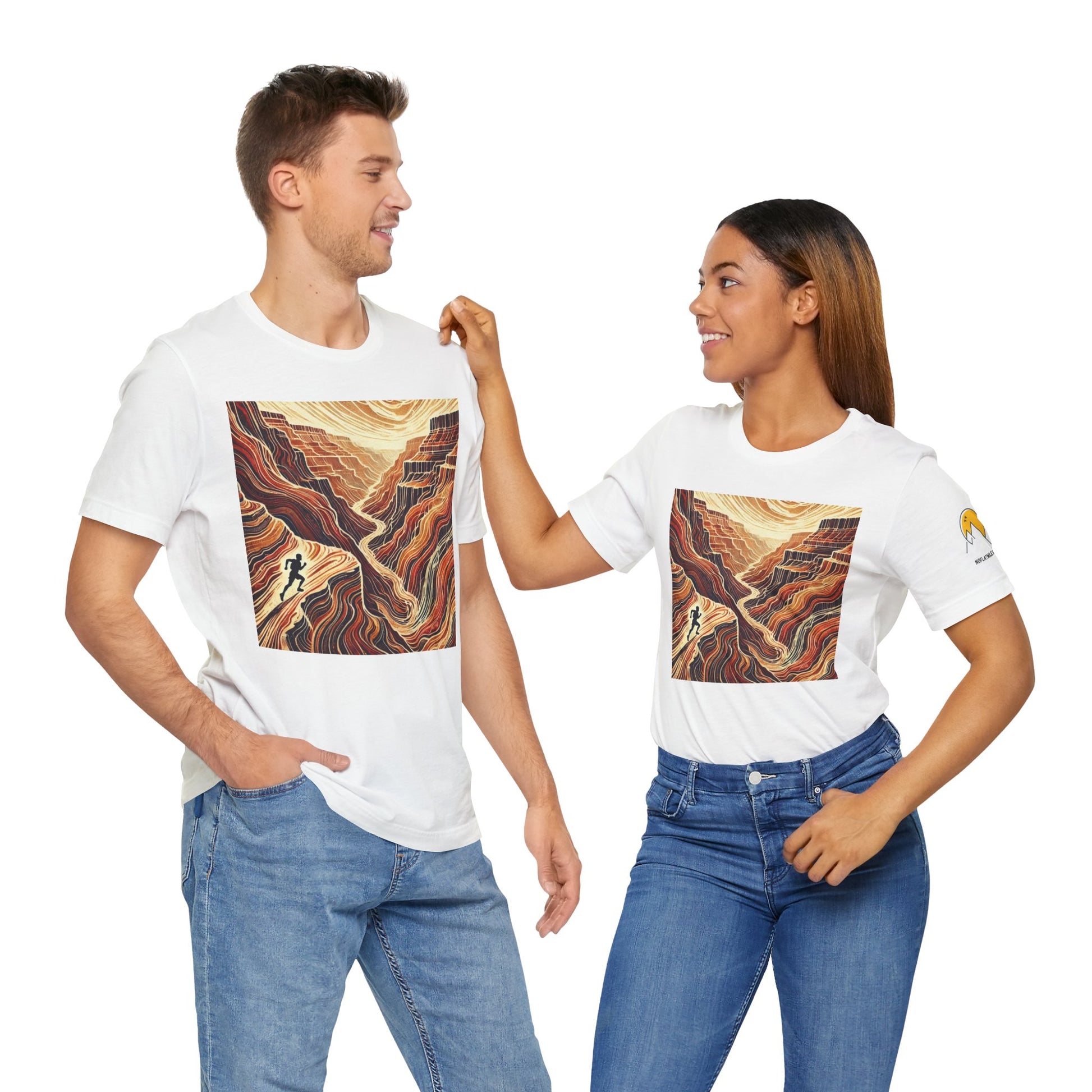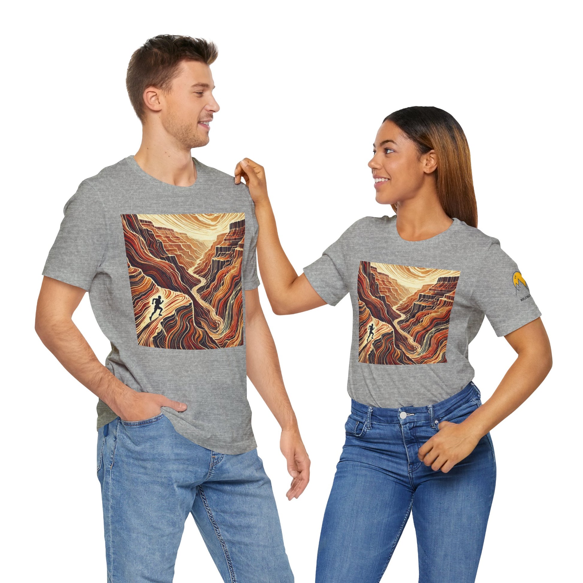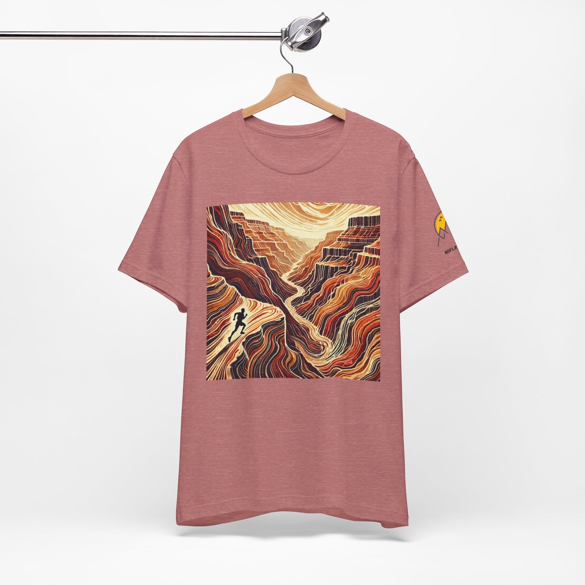 The daily shirt for runners who don’t chase flats. Our “Canyon Flow” print captures the rim-to-rim lines and the grit it takes to cross them. Soft, light, and built for post-run coffee, packet pickup, or a flight to your next race.