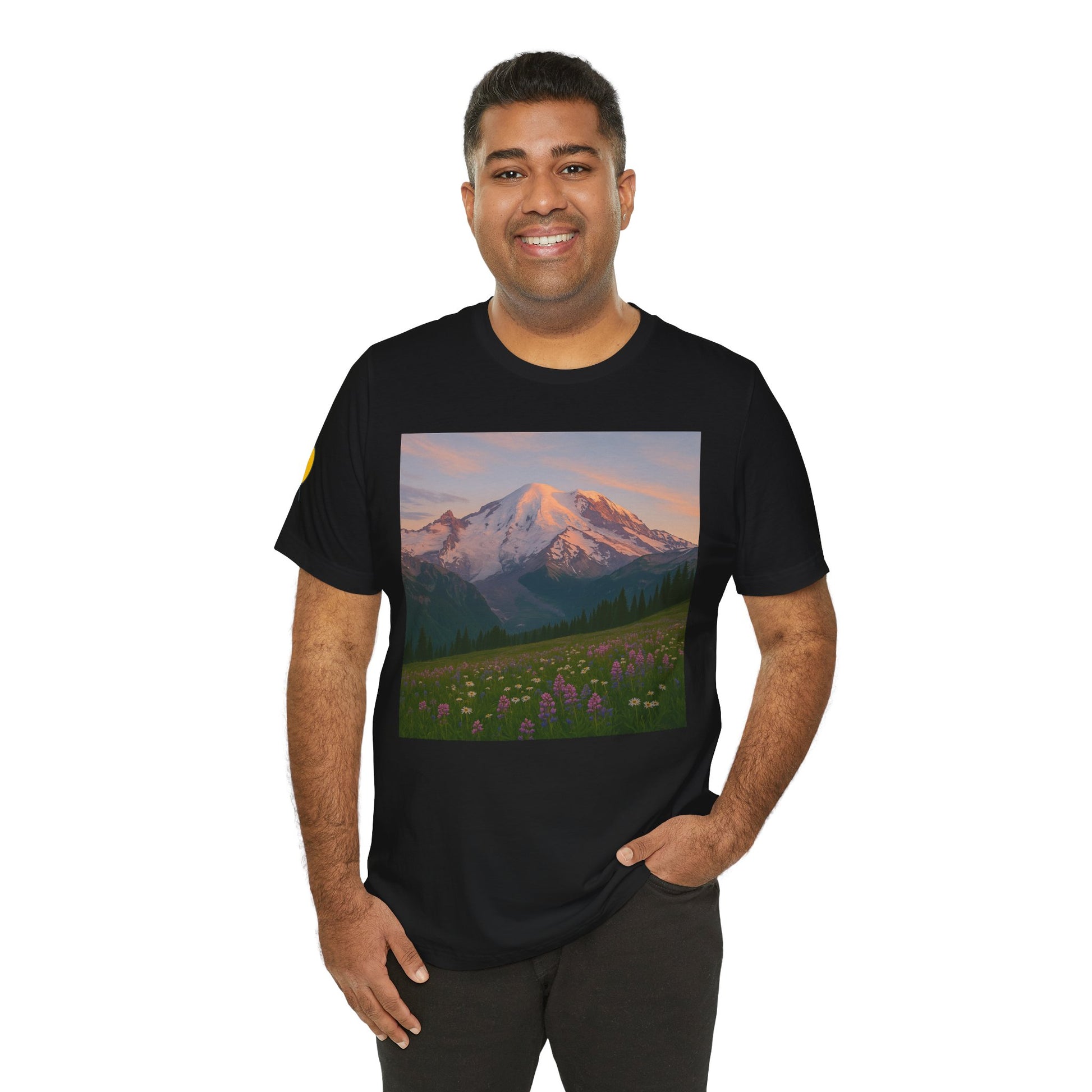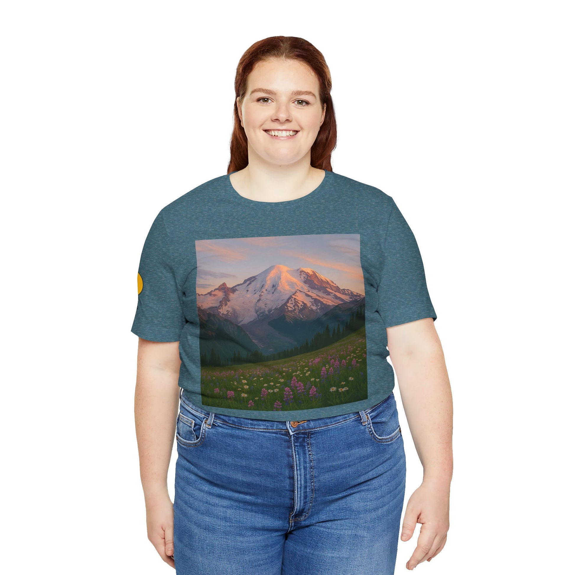 Wildflowers at your feet, a glacier-lit giant up ahead. This tee wears like first light at the trailhead—clean, bright, and quietly daring you to add the ridge. The art does the talking: meadow in full bloom, summit on fire, path that refuses to be flat. Put it on and your day develops elevation gain.